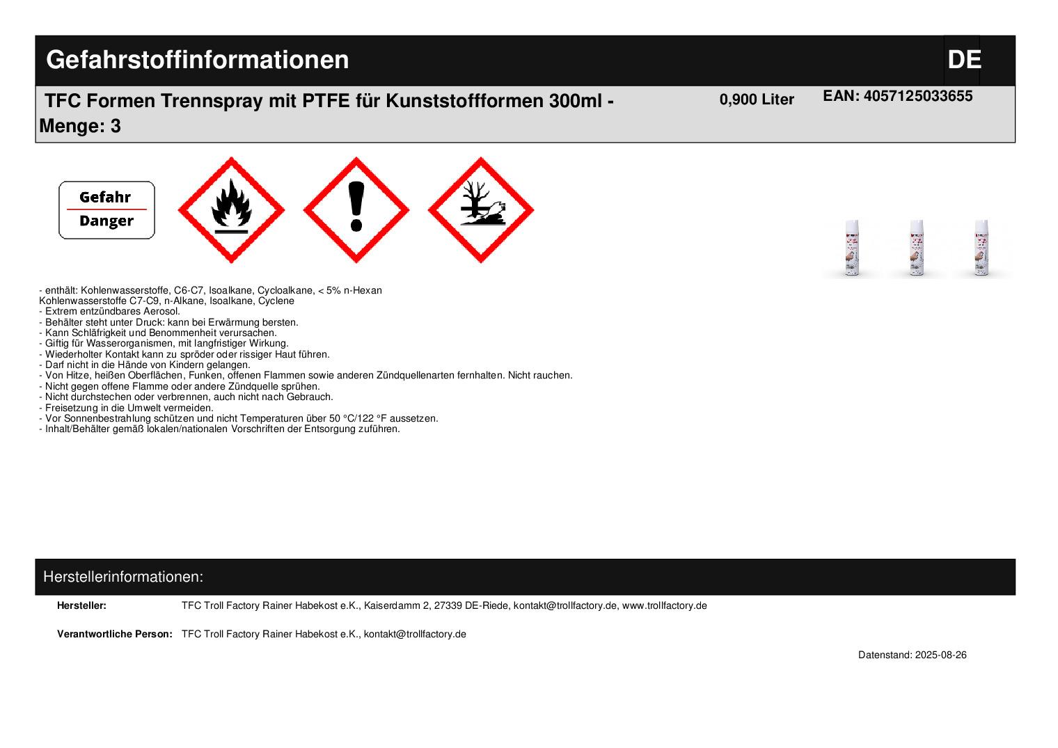 Produktinformationen "TFC Formen Trennspray mit PTFE für Kunststoffformen 300ml"