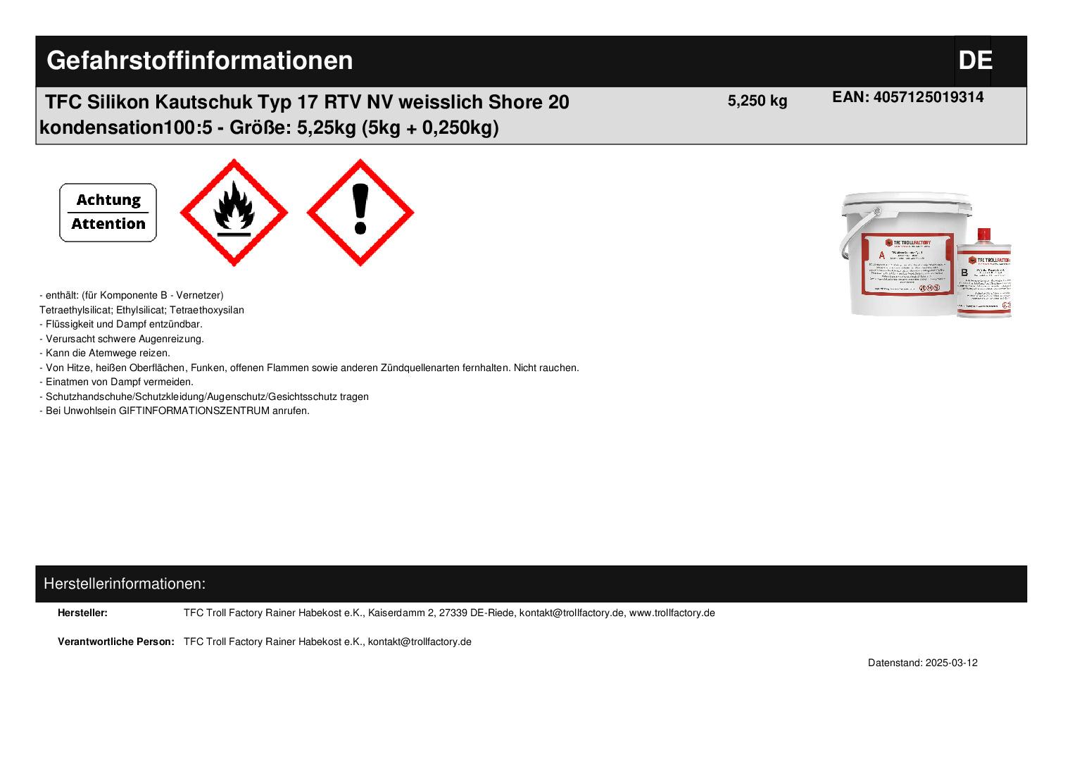 Produktinformationen "TFC Silikon Kautschuk Typ 17 RTV NV weisslich Shore 20 kondensation 100:5"