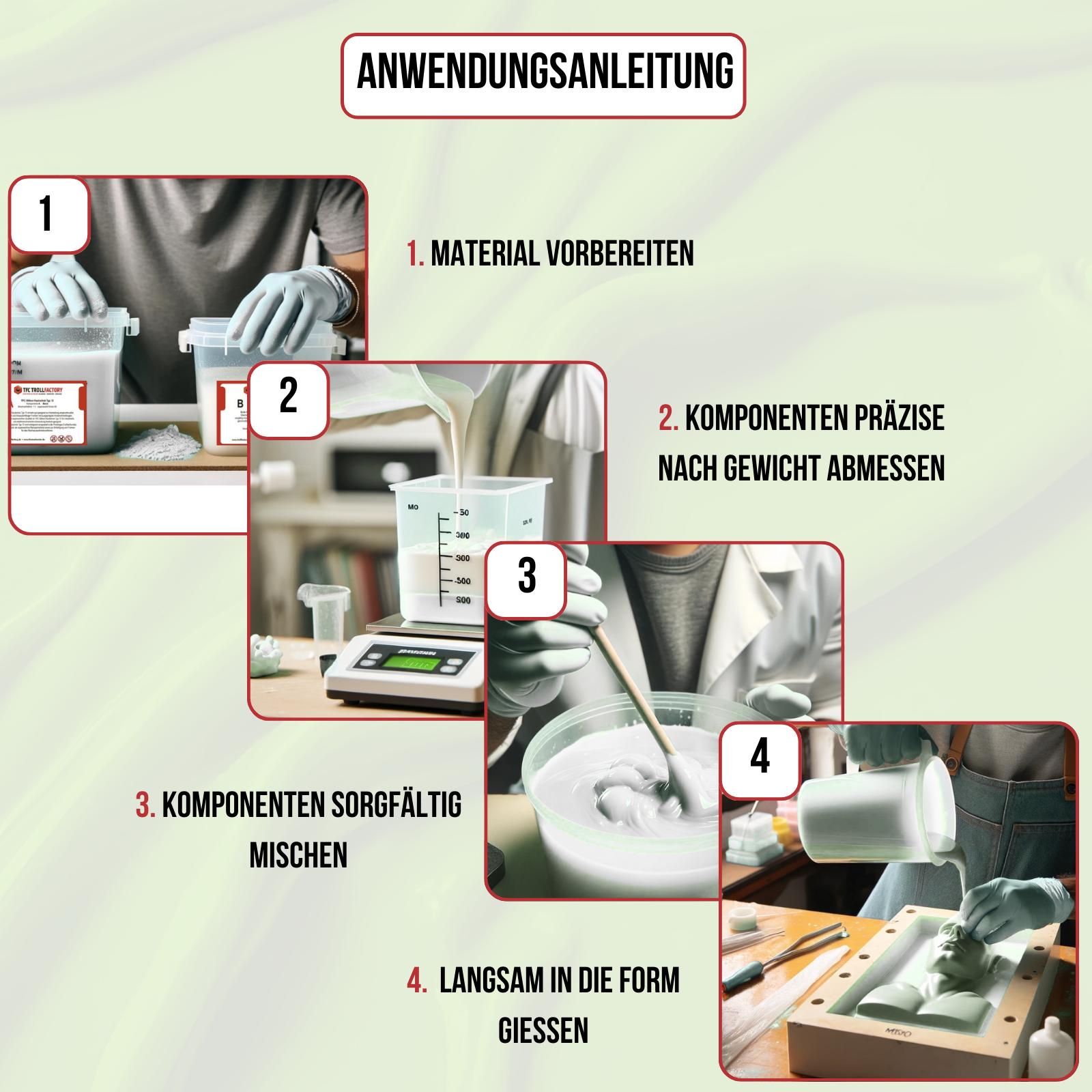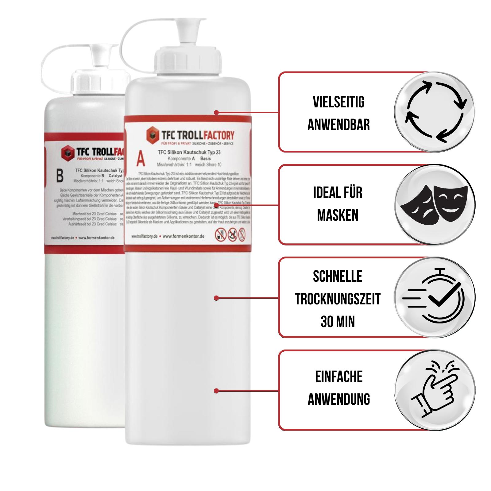 TFC Silikon Kautschuk Typ 23 beinhaltet neben den beiden Silikon Kautschuk Komponenten Base und Catalyst eine dritte Komponente, den sog. Deadner.