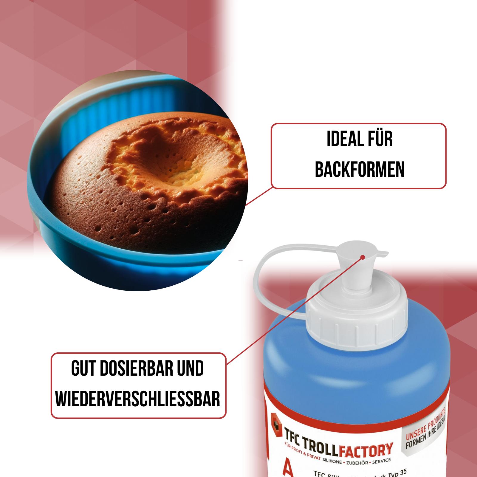 TFC Silikon Kautschuk Typ 35 ist BfR und FDA geprüft und somit für den Kontakt mit Lebensmitteln zugelassen und zum Ausgießen von Backformen, Schokoladenformen, Zuckerguss uvm. bestens geeignet.