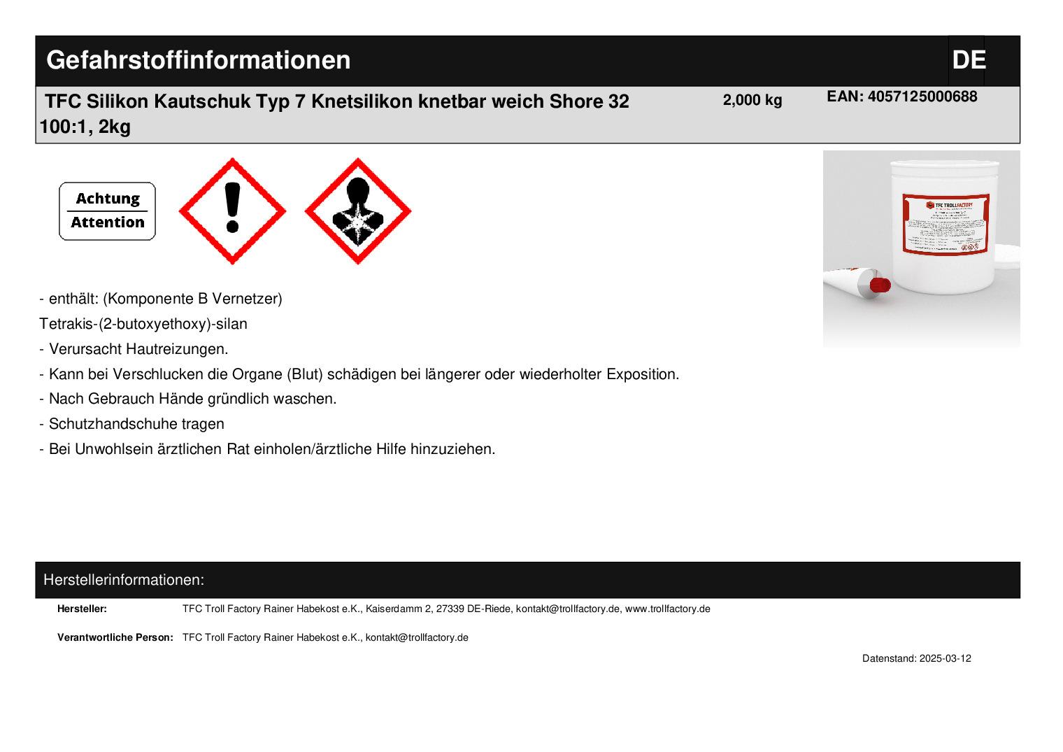 Produktinformationen "TFC Silikon Kautschuk Typ 7 Knetsilikon knetbar weich Shore 30 100:5 "